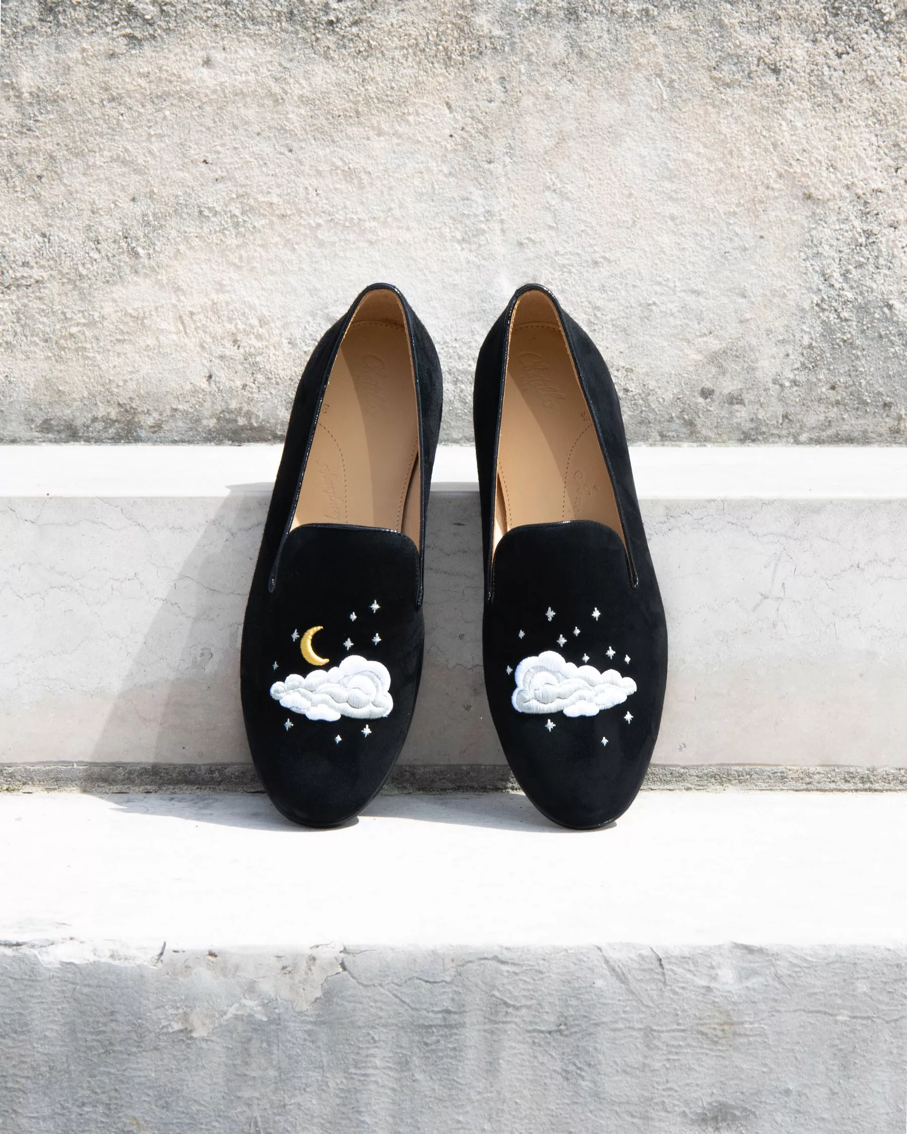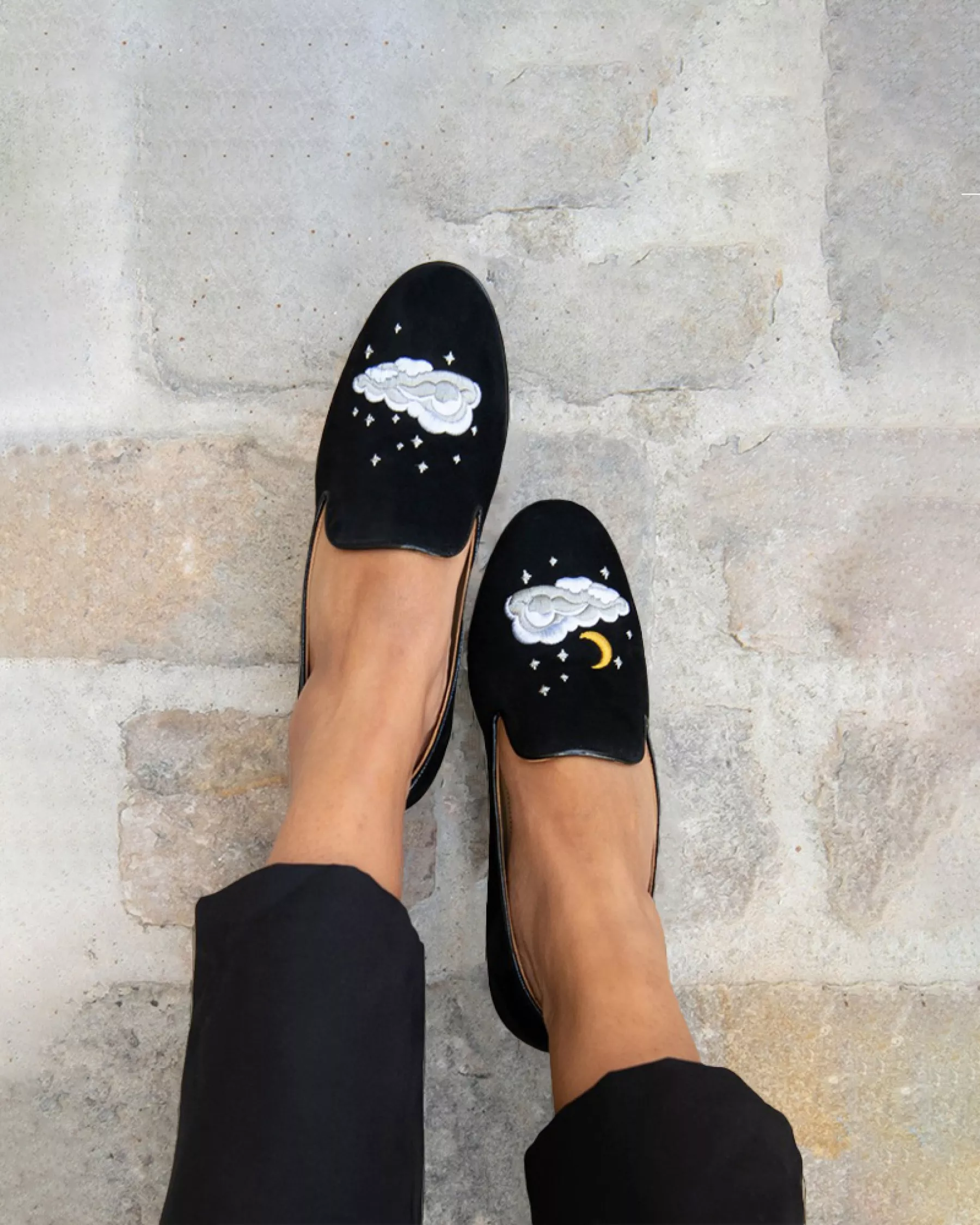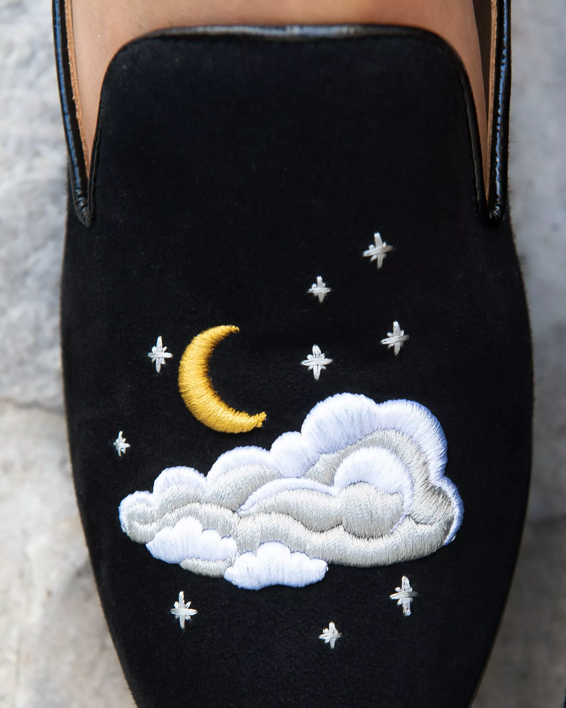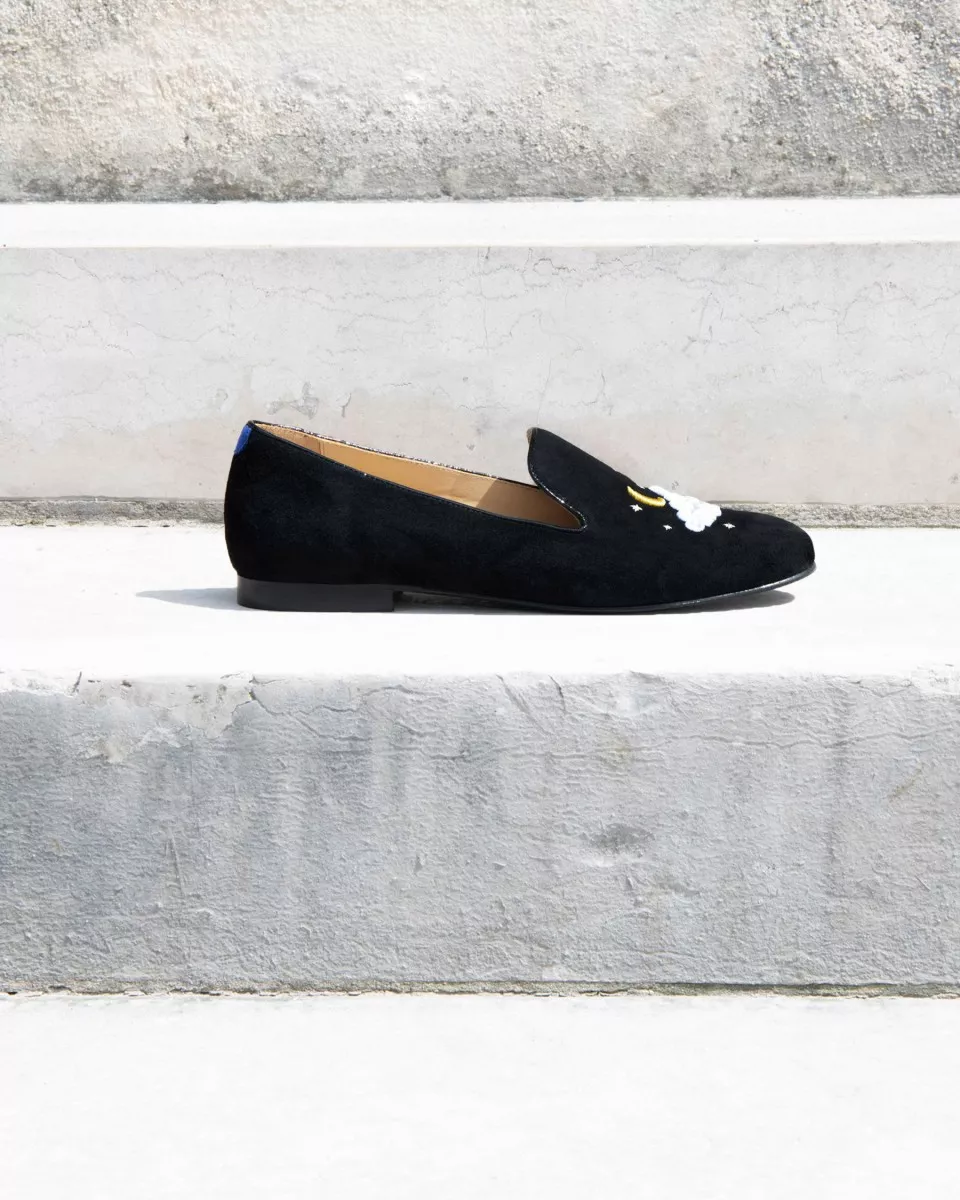 Black suede slippers with embroideries